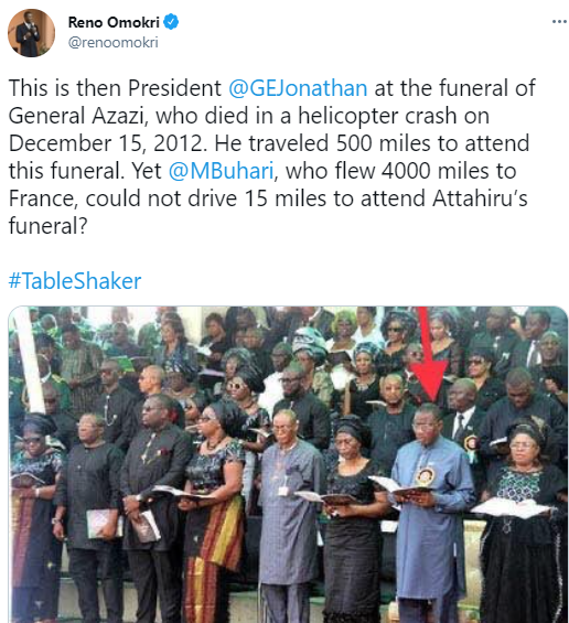 Reno believes if President Buhari could fly to Paris to attend a function, he should have made it to the funeral of the military officers who lost their lives during service. See his tweets below