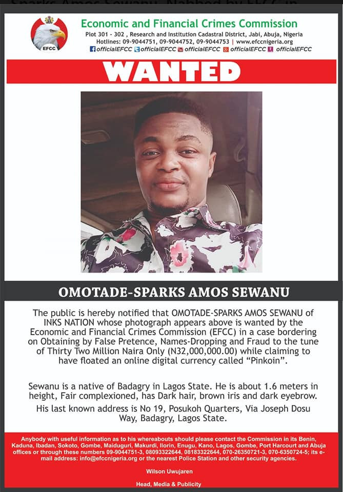 Omotade-Sparks who hails from Badagry Lagos State was declared wanted by the EFCC in November 2020 after efforts to apprehend him failed. He is the alleged mastermind of a huge pyramid investment scheme through which many citizens were defrauded of monies to the tune of over Thirty-Two Million Naira.
