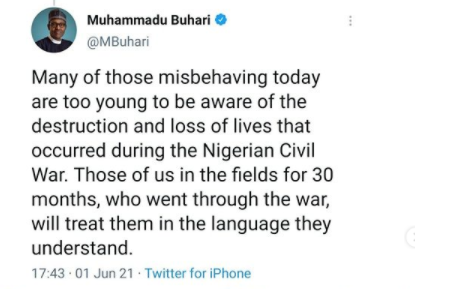 Buhari on Tuesday, June 1, via his Twitter handle, said those who are too young to understand what occurred during the civil war will soon be treated in a ‘language they will understand’