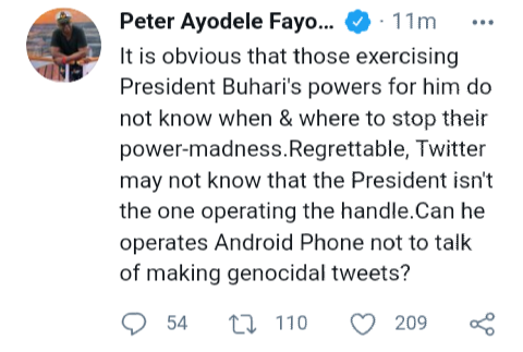 “Regrettable, Twitter may not know that the President isn’t the one operating the handle.Can he operate Android Phone not to talk of making genocidal tweets?”