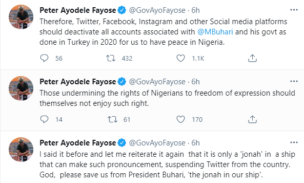 Following the Federal government’s decision to suspend the operations of Twitter in Nigeria after the platform deleted President Buhari’s tweets referencing the Civil war, former Ekiti state governor, Ayo Fayose, has called on Twitter and other social media platforms to delete the accounts of President Buhari. His tweets read