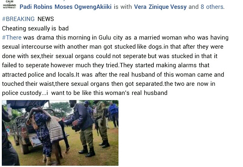 “Cheating sexually is bad. #There was drama this morning in Gulu city as a married woman who was having sexual intercourse with another man got stucked like dogs.in that after they were done with sex,their sexual organs could not seperate but was stucked in that it failed to seperate however much they tried.They started making alarms that attracted police and locals.It was after the real husband of this woman came and touched their waist,there sexual organs then got separated.the two are now in police custody…i want to be like this woman’s real husband.”