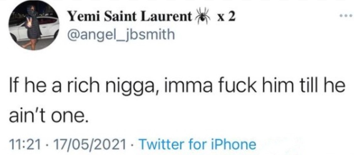 The tweet was shared on May 17, 2021 and it read “If he a rich nigga, imma fuck him till he ain’t one”.