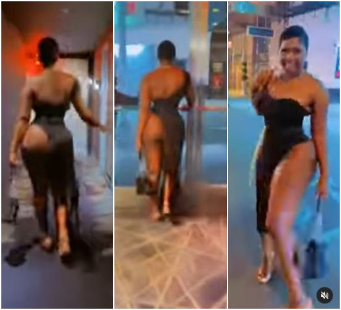 The actress via her verified Instagram page shared a video of herself stepping out from her hotel in a partially exposed sequence gown leaving her half-naked.
