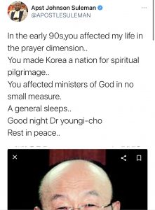 Reacting to Cho’s death, Nigerian televangelist, Apostle Johnson Suleman took to his official Twitter page on Tuesday to pen down his heart-tribute to the late gospel preacher describing him as someone who “affected my life in the prayer dimension”.