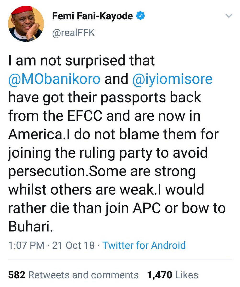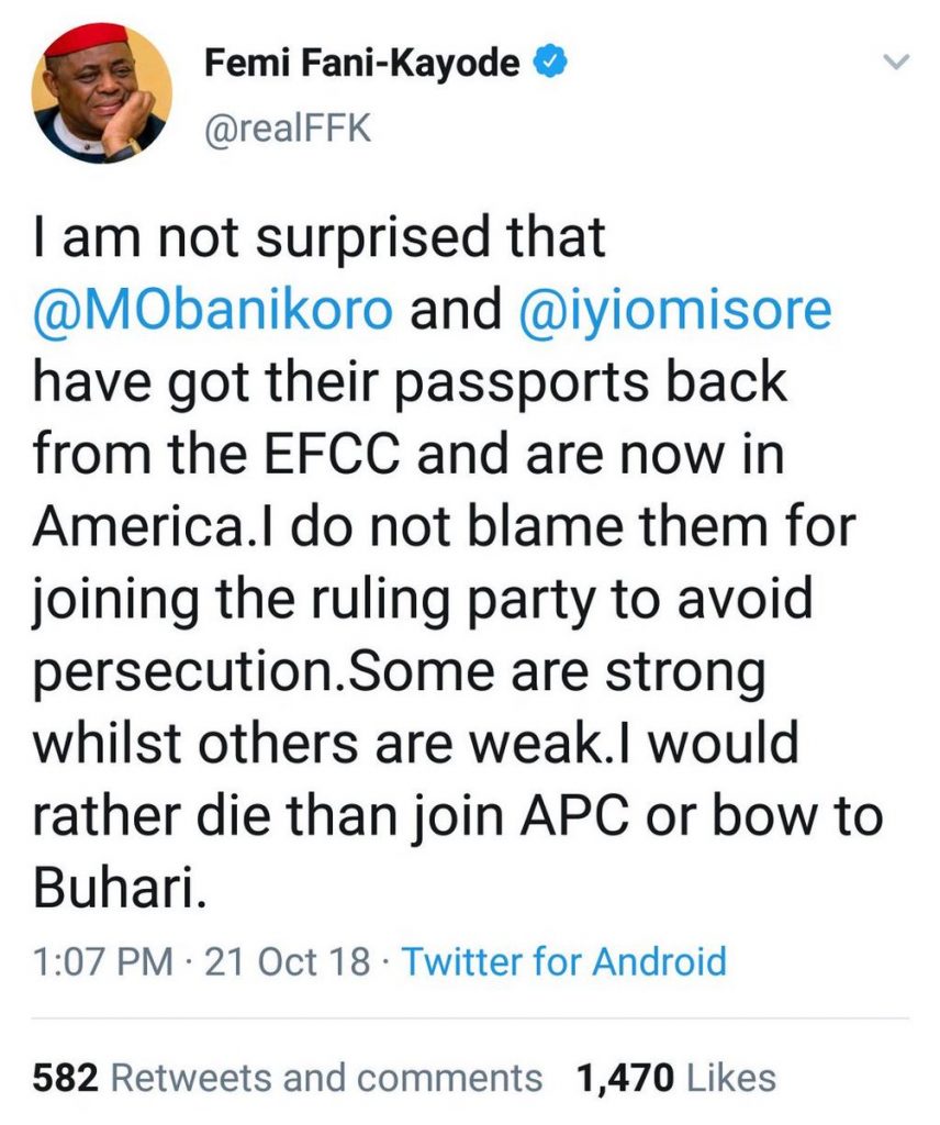 A tweet by Femi Fani-Kayode in 2018 in which he vowed to die than join the All Progressives Congress has resurfaced.