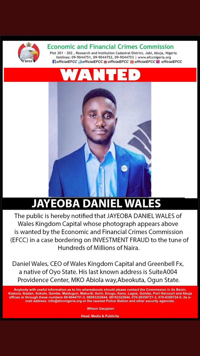 “The public is hereby notified that Adewale Daniel Jayeoba of Wales Kingdom Capital is wanted by the Economic and Financial Crimes Commission (EFCC) in the alleged case of an investment scam,” the anti-graft agency’s Head of Media and Publicity, Wilson Uwujaren, said on Monday.