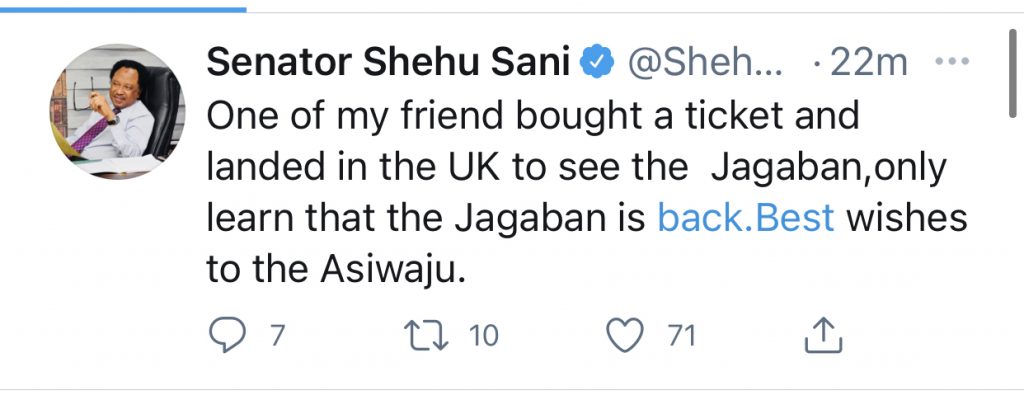 “One of my friends bought a ticket and landed in the UK to see the Jagaban, only learn that the Jagaban is back. Best wishes to the Asiwaju,” Sani tweeted.