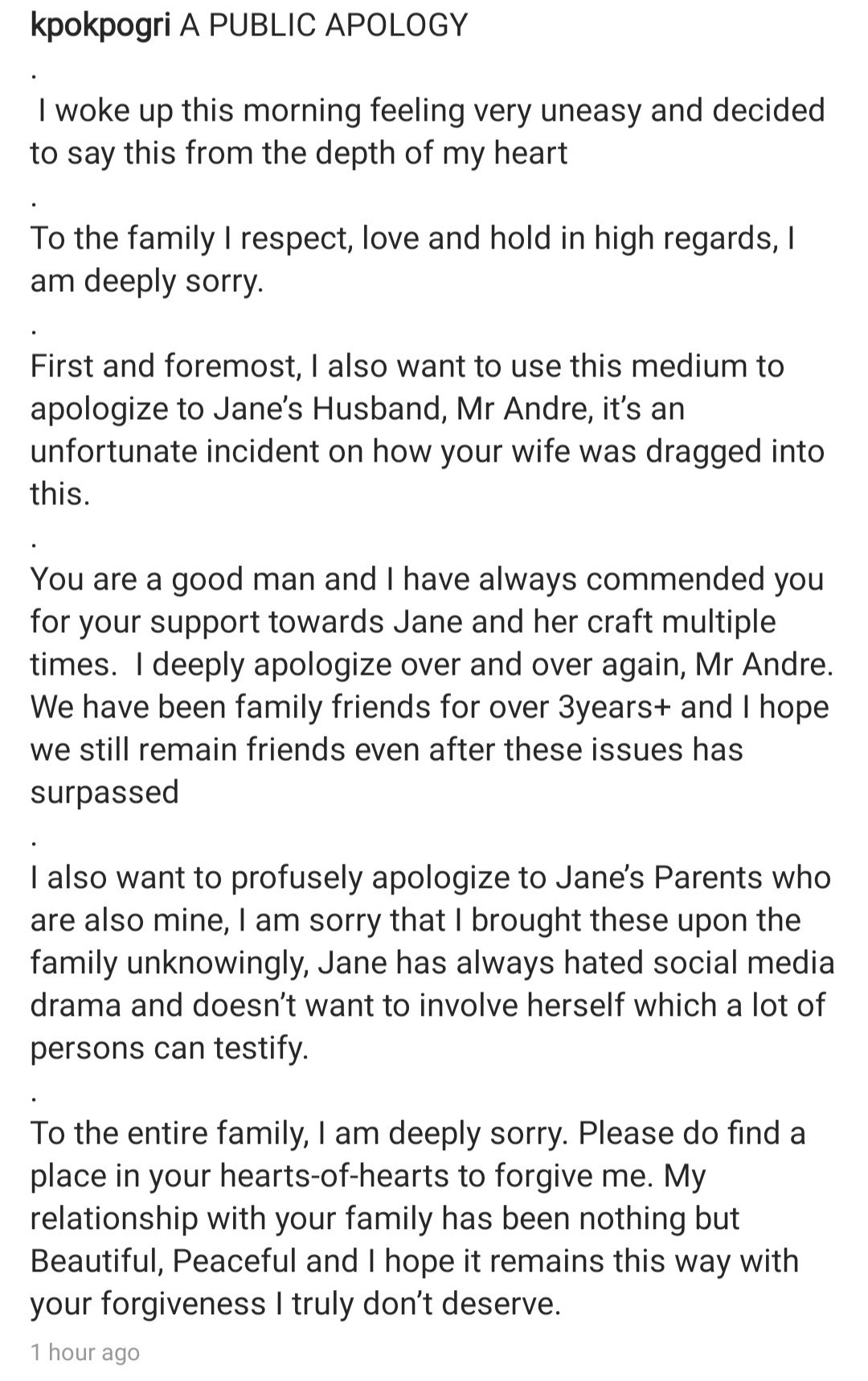 A check on his IG page shows the apology he posted on his IG page to Janemena’s family has disappeared.