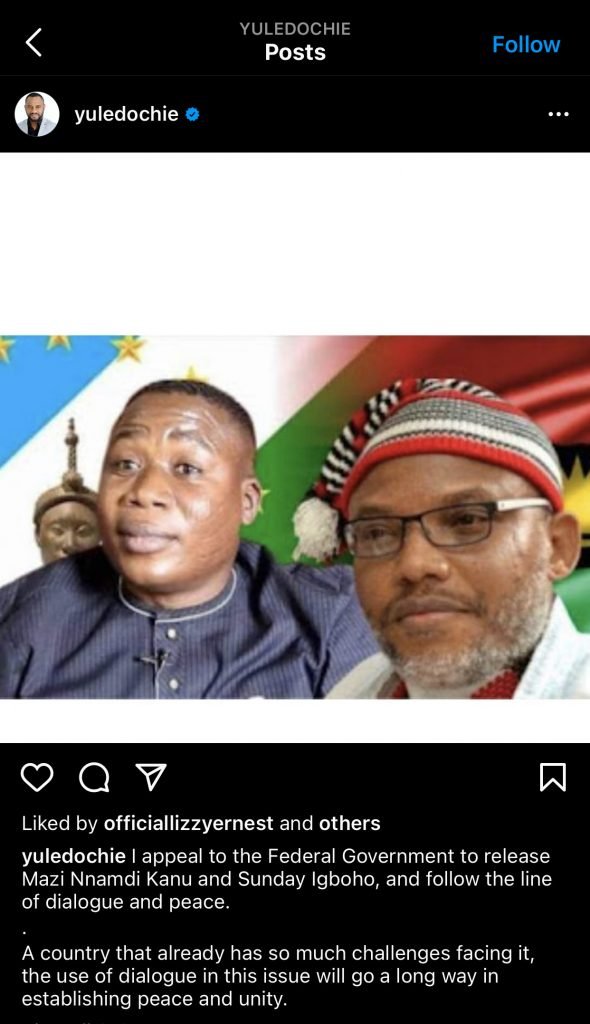 Yul Edochie, a Nollywood actor, has called for the release of the leader of Indigenous People of Biafra, IPOB, Nnamdi Kanu, and Sunday Igboho, Yoruba Nation agitator.
