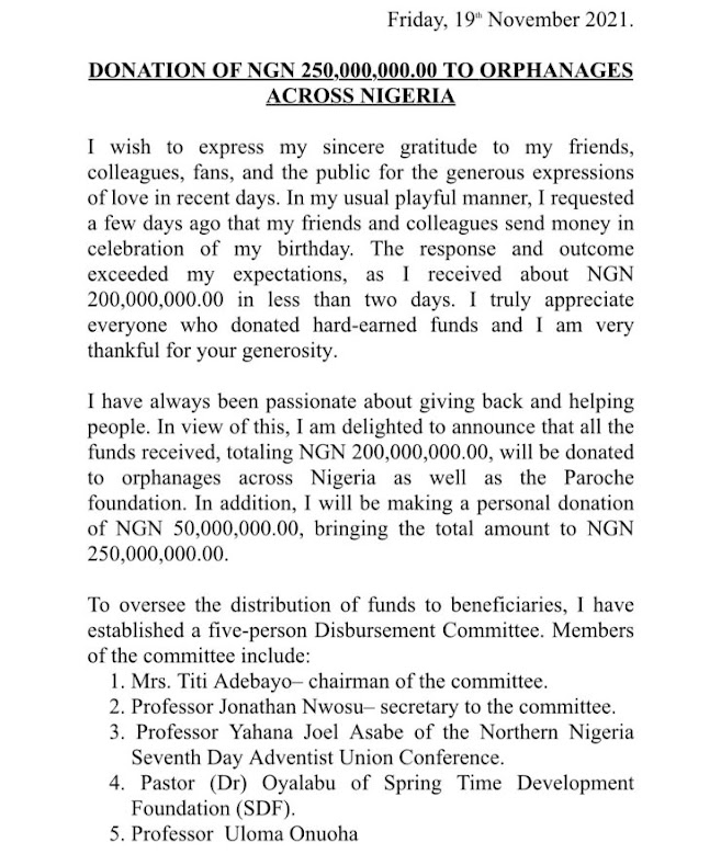 In addition to the 200 million naira, he made a personal donation of 50 million naira, bringing the total amount of money to N250 million, to be distributed to orphanages homes across the country.