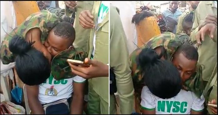 The corps member in a video went on his knees as he inserted the ring into the finger of the female soldier amid cheers of fellow corps members.