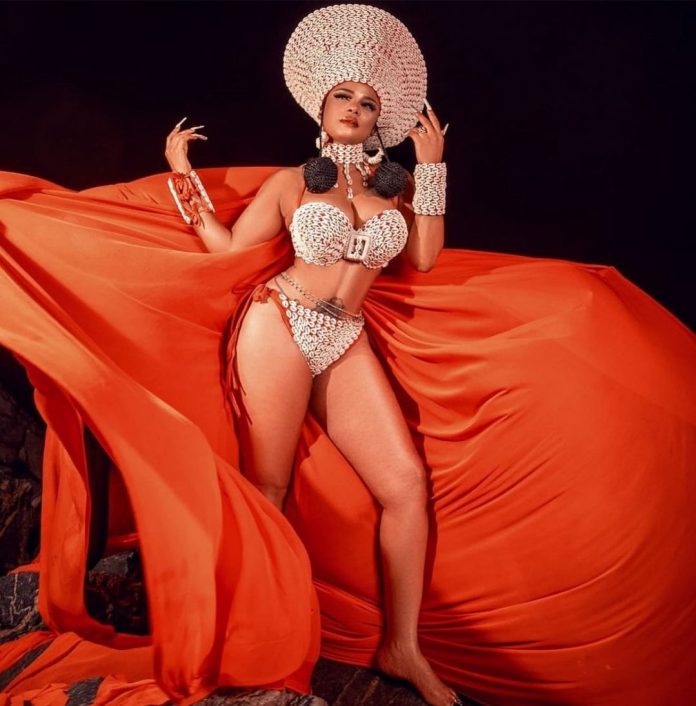 The mother-of-two showed off her curves as she rocked a bra and panties embellished with cowries.