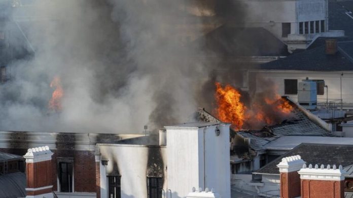 Moloto Mothapo, head of communications for the parliament, tweeted on Monday afternoon: “Unfortunately after almost two days of brave battle with the flames in the National Assembly Building, more fire has just been fanned up.