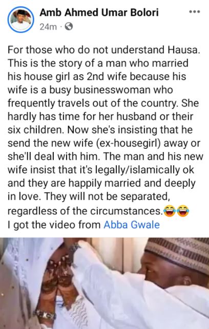 “For those who do not understand Hausa. This is the story of a man who married his house girl as 2nd wife because his wife is a busy businesswoman who frequently travels out of the country.