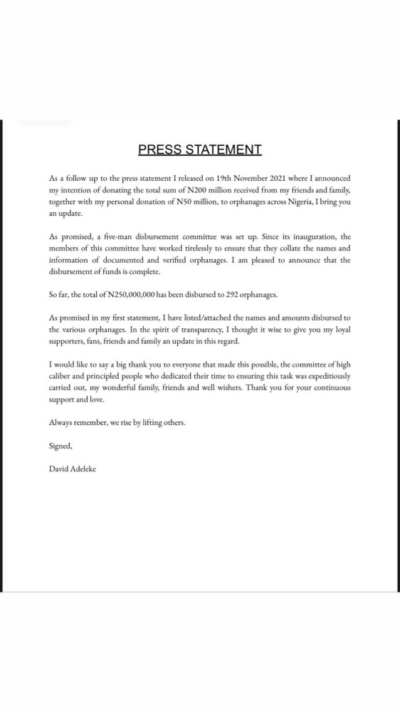 Award-winning Nigerian singer, Davido has revealed beneficiaries of his promise to disburse ₦250m to 292 orphanages across the country.