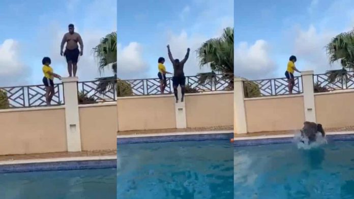 Plus-sized man creates a scene after landing awkwardly in a pool (video)