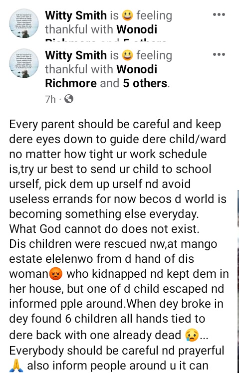 “What God cannot do does not exist.Dis children were rescued nw, at mango estate elelenwo from d hand of dis woman who kidnapped nd kept dem in her house, but one of d child escaped nd informed pple around. When dey broke in dey found 6 children all hands tied to dere back with one already dead”