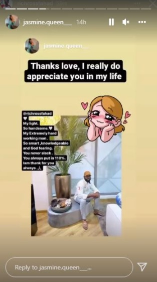 She wrote: “@richrossfahad My light. so handsome, my extremely hardworking man, so smart, knowledgeable and God-fearing. You never slack. You always put 110%. I am thankful for you always.”