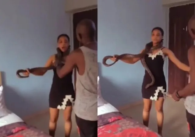 A man believed to be the handler could be seen telling her to let go of its tail that it won’t hurt her, but the more she tried to stay calm, the more the Snake moved.