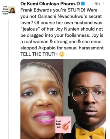 “Frank Edwards you’re STUPID! Were you not Osinachi Nwachukwu’s secret lover? Of course her own husband was “jealous” of her. Joy Nunieh should not be dragged into your foolishness. Joy is a real woman & strong one & she once slapped Akpabio for sexual harassment. TELL THE TRUTH,” she wrote.