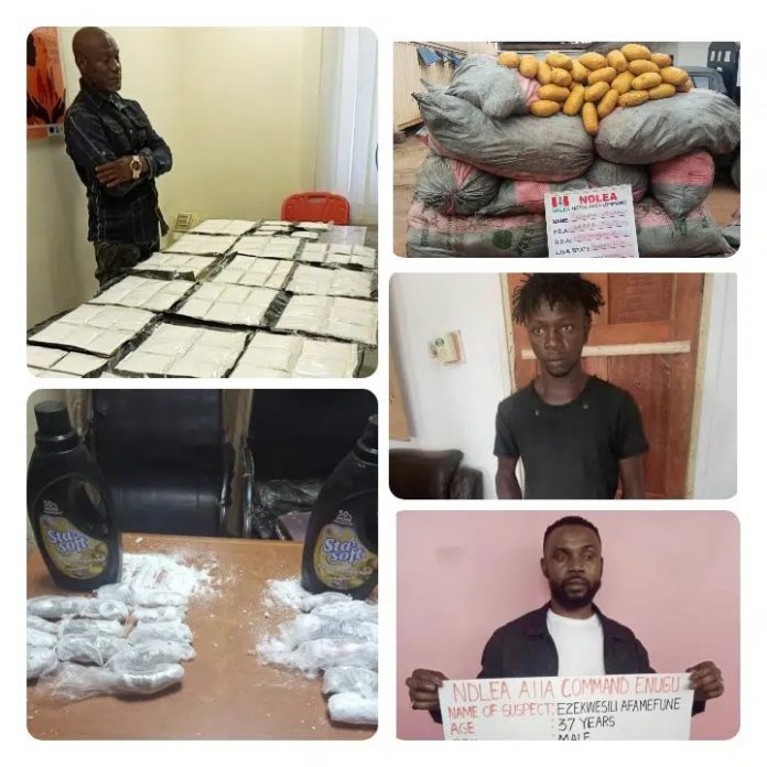 In another development, the agency said it intercepted big pellets of skunk, made from unpollinated cannabis plants, concealed in detergent containers at Akanu Ibiam International Airport, Enugu.