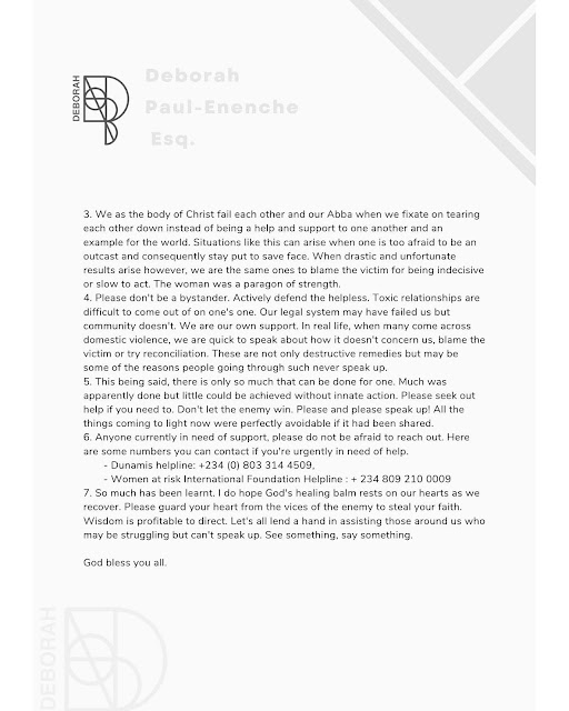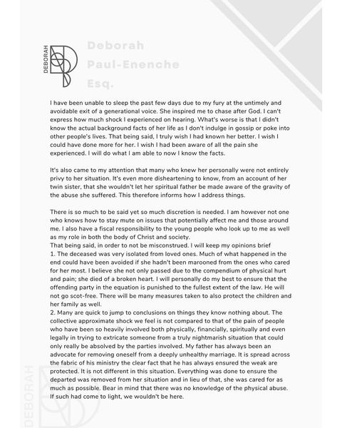 Daughter of Pastor Paul Enenche of Dunamis International Gospel Center, Deborah, has disclosed that her father had no knowledge of the physical abuse of Osinachi Nwachukwu experienced in the hands of her husband, which led to her death.
