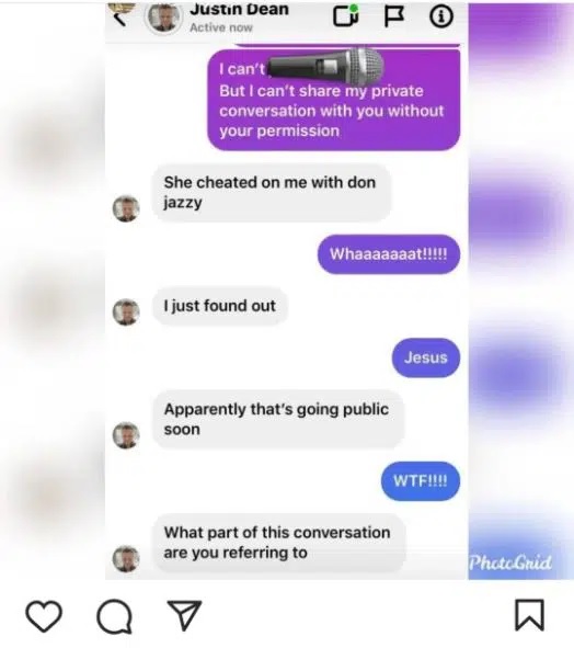 Justin Dean, the husband of Nigerian dancer, Korra Obidi, in a leaked chat has accused his estranged wife of cheating on him with popular producer and singer, Don Jazzy.
