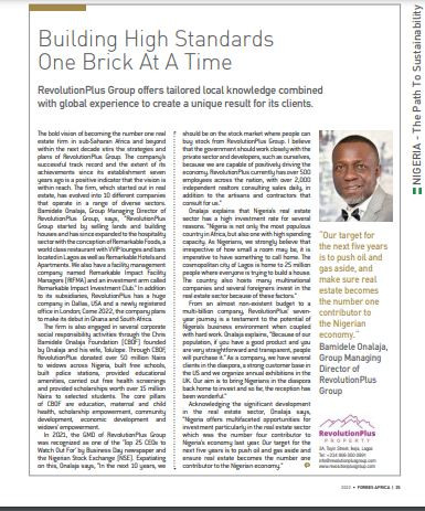 According to Forbes Africa, the growth of RevolutionPlus Group is a positive indicator that the vision of being the number one real estate in sub-Sahara Africa is within reach.