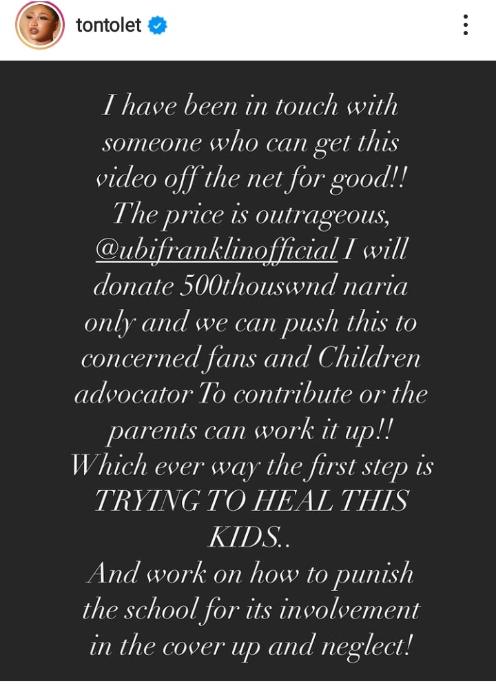 “I have been in touch with someone who can get this video off the net for good! The price is outrageous. @ubifranklinofficial. I will donate 500 thousand naira only and we can push this to concerned fans and children advocator to contribute or the parents can work it up. Which ever way, the first step is trying to heal these kids. And work on how to punish the school for it’s involvement in the cover up and neglect.”