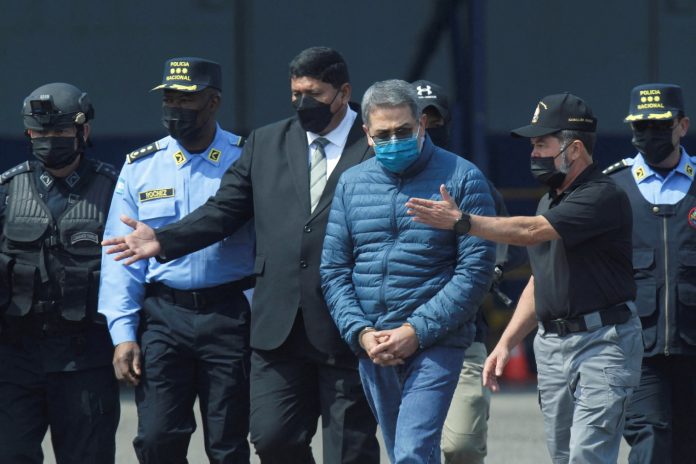 Juan Orlando Hernández, the once-powerful former president, was handcuffed as he boarded an airplane with agents from the U.S. Drug Enforcement Administration to face legal proceedings in New York City.