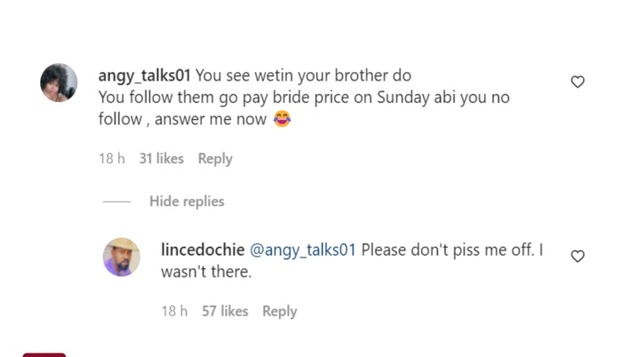 A netizen questioned Linc asking, “You see wetin your brother do. You follow them go pay bride price on Sunday abi you no follow, answer me now.”