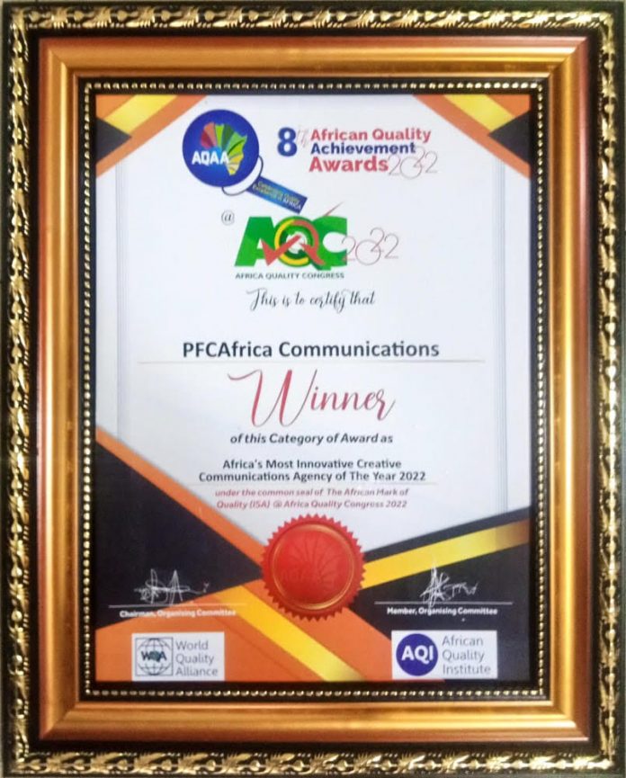 One of the leading Public Relations Agency in Nigeria and member of the Public Relations Consultants Association of Nigeria (PRCAN), PFCAfrica Communications Limited, has emerged “Africa’s Most Innovative & Creative Communications Agency”,