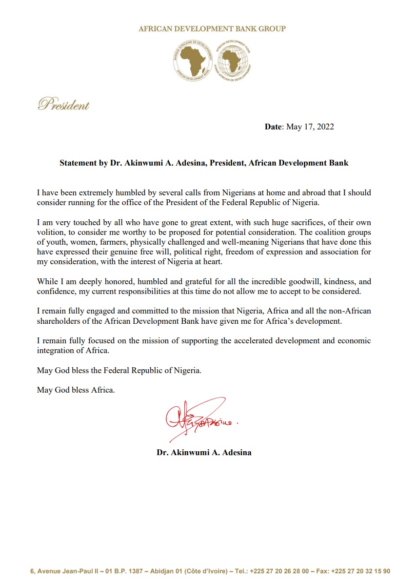 President of the African Development Bank, Dr Akinwumi Adesina, has ruled himself out of the 2023 Presidential race in Nigeria.