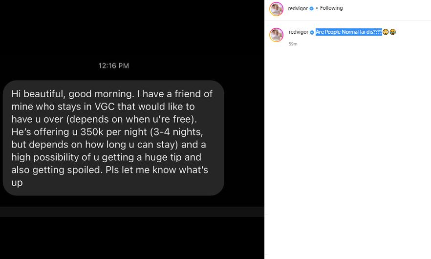 In the message, which she shared on her Instagram page, the sender wrote that a friend who stays at VGC is offering her N350k per night to spend 3-4 nights with him.