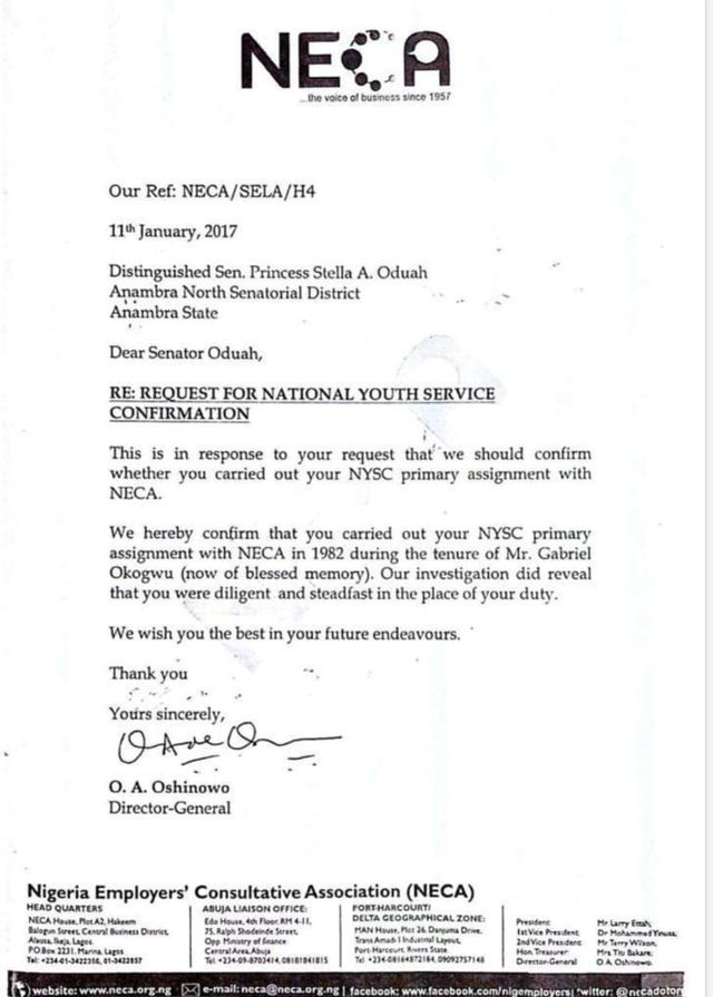 Stella Oduah reacts to claim of not completing her service year, shares photo of her in NYSC uniform and a letter from NECA confirming she did her NYSC