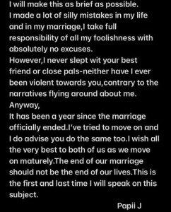 Sharing his own side of the story, Ameh admitted to making silly mistakes in his life and marriage and takes full responsibility for his actions.