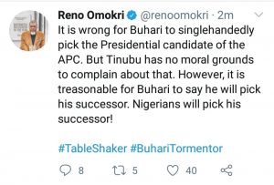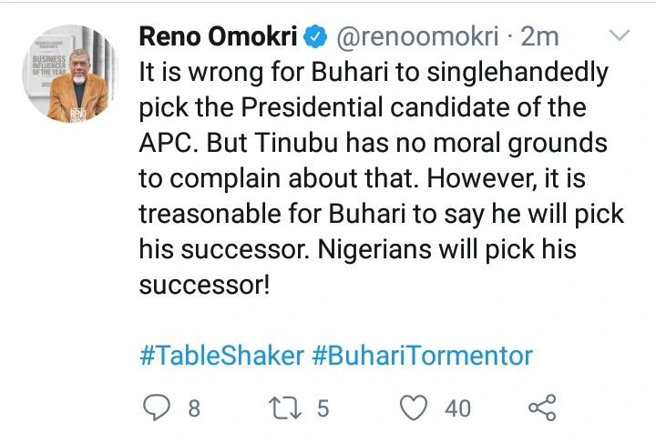 “It is wrong for Buhari to singlehandedly pick the Presidential candidate of the APC. But Tinubu has no moral grounds to complain about that. However, it is treasonable for Buhari to say he will pick his successor. Nigerians will pick his successor!”