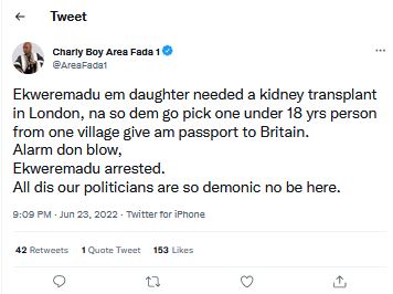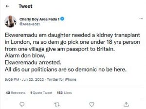 His tweet read: “ Ekweremadu’s daughter needed a kidney transplant in London, na so dem go pick one under 18 yrs person from one village give am passport to Britain.