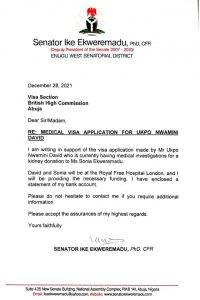 After former Deputy President of the Nigerian Senate, Ike Ekweremadu and wife, Beatrice were denied bail by an Uxbridge Magistrates’ Court in the United Kingdom, a letter by the senator requesting a British visa for a 15-year-old organ donor for his daughter, has emerged.