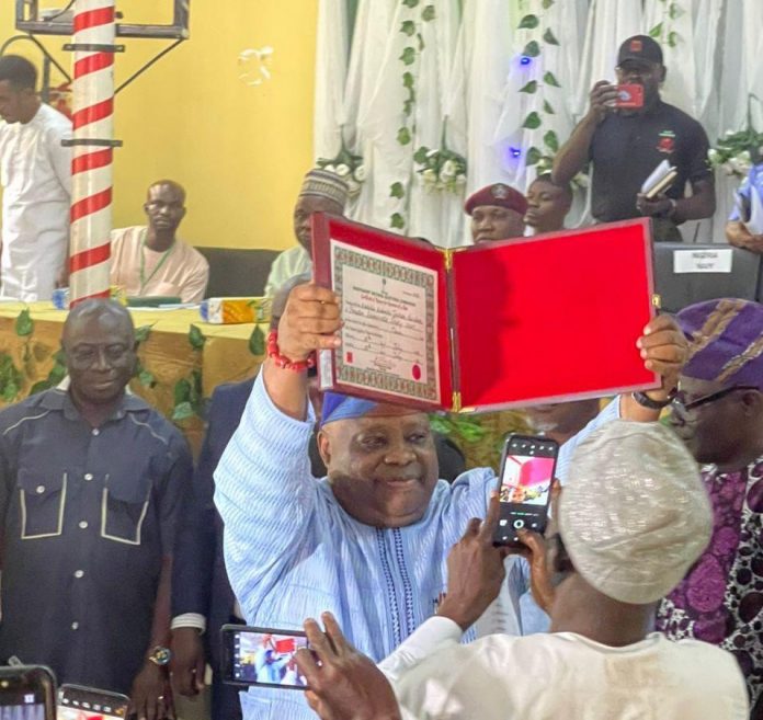 Senator Ademola Adeleke has received certificate of return from the Independent National Electoral Commission.