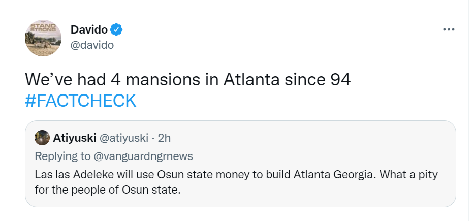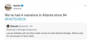 Davido revealed that his family has had 4 mansions in Atlanta since 1994, in response to a Twitter user who tweeted “Las las Adeleke will use Osun state money to build Atlanta Georgia. What a pity for the people of Osun state.”