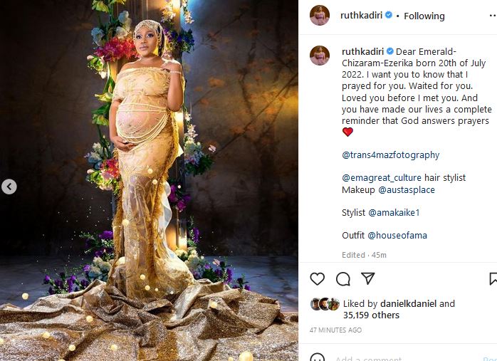 She wrote: “Dear Emerald-Chizaram-Ezerika born 20th of July 2022. I want you to know that I prayed for you. Waited for you. Loved you before I met you. And you have made our lives a complete reminder that God answers prayers.”
