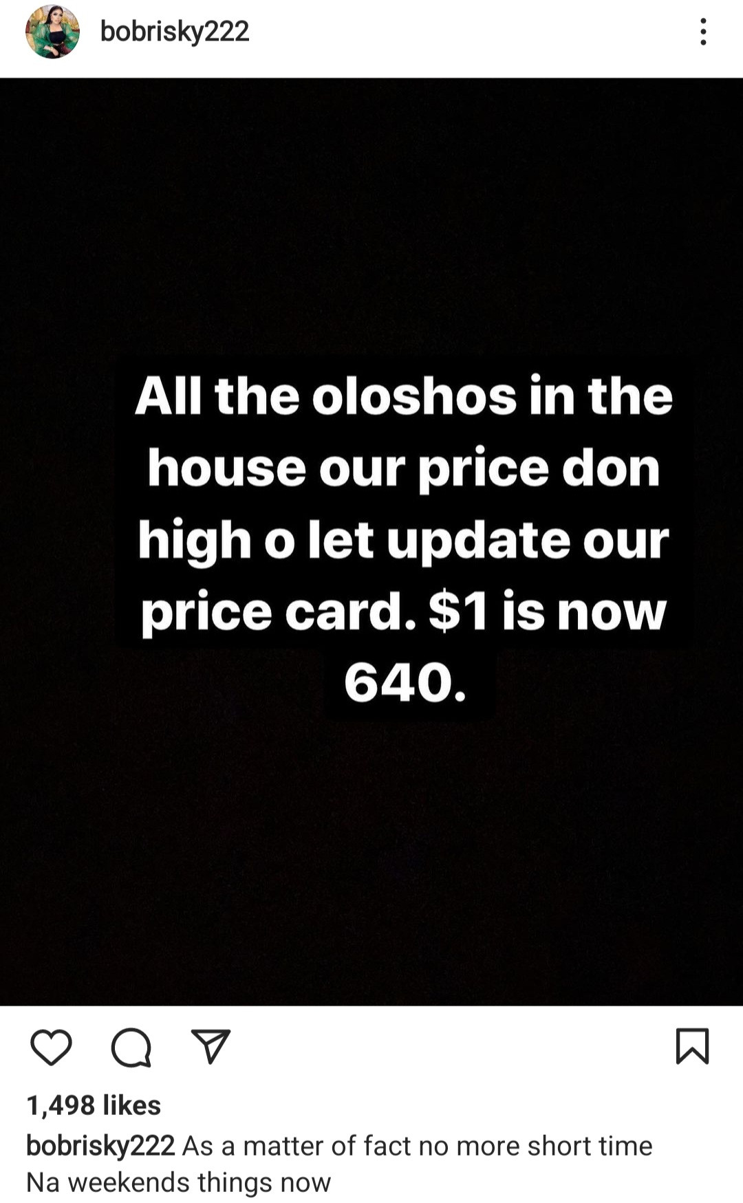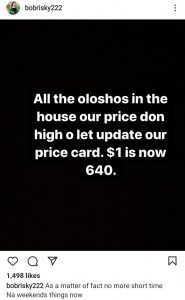 He wrote: “All the oloshos in the house, our price don high o. Let’s update our rate card. $1 is now 640.”
