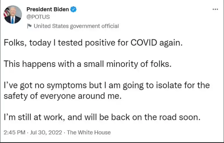 US president, Joe Biden has tested positive for COVID-19 again, and will now head back into isolation just days after he was cleared to resume his duties.