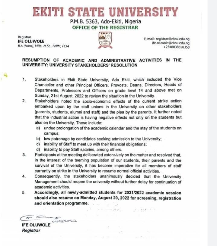 The Registrar in the statement titled: “Resumption of Academic and Administrative Activities in the University: University Stakeholders’ Resolution”, read, “Stakeholders in Ekiti State University. Ado Ekiti, which included the Vice-Chancellor and other Principal Officers, Provosts, Deans, Directors, Heads of Departments, Professors and Officers on grade level 14 and above met on Sunday, 21st August 2022 to review the situation in the University Stakeholders noted the socio-economic effects of the current strike action embarked upon by the staff unions in the University on other stakeholders