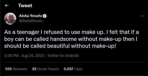 She tweeted; ”As a teenager I refused to use make up. I felt that if a boy can be called handsome without make-up then I should be called beautiful without make-up!”