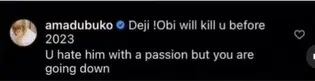 In reaction to the post, Apostle Anselm took to his Instagram to curse the activist, saying; “Deji! Obi will kill you before 2023. You hate him with passion, but you are going down.”