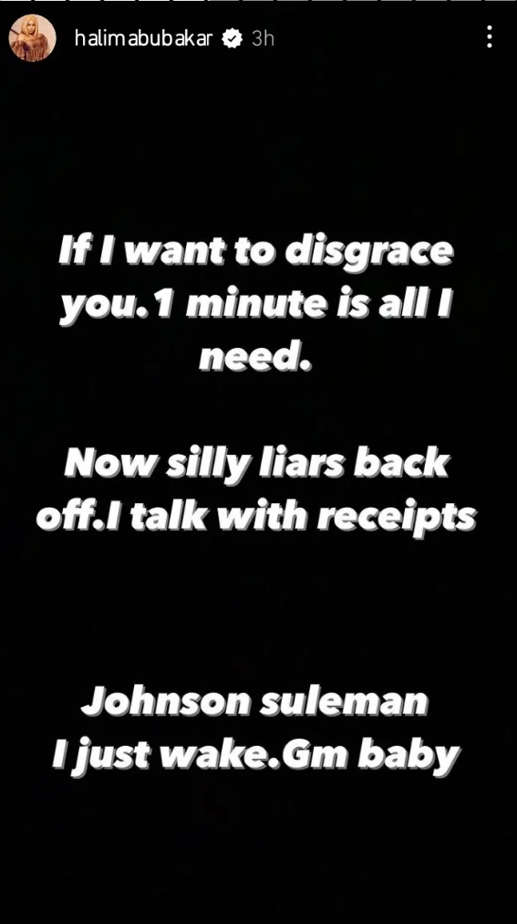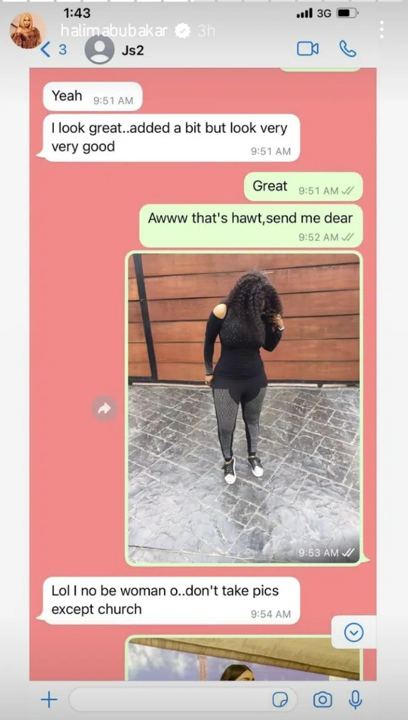 Nollywood actress, Halima Abubakar, has shared screenshots of conversations shared with the senior pastor and founder of Omega Fire Ministries, Apostle Johnson Suleman.