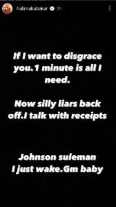 Recall that for over two months Halimar has been spilling her sexcapade with Suleiman with claims that he is responsible for her current ailment.
